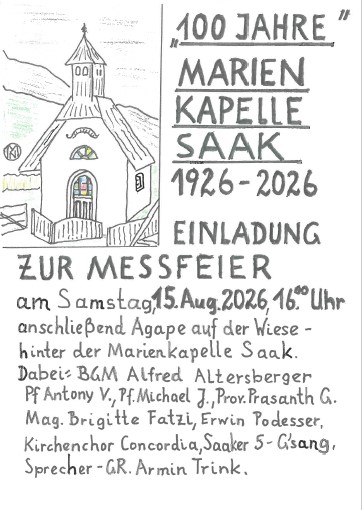 EINLADUNG ZUR MESSFEIER - 100 Jahre Marienkapelle Saak